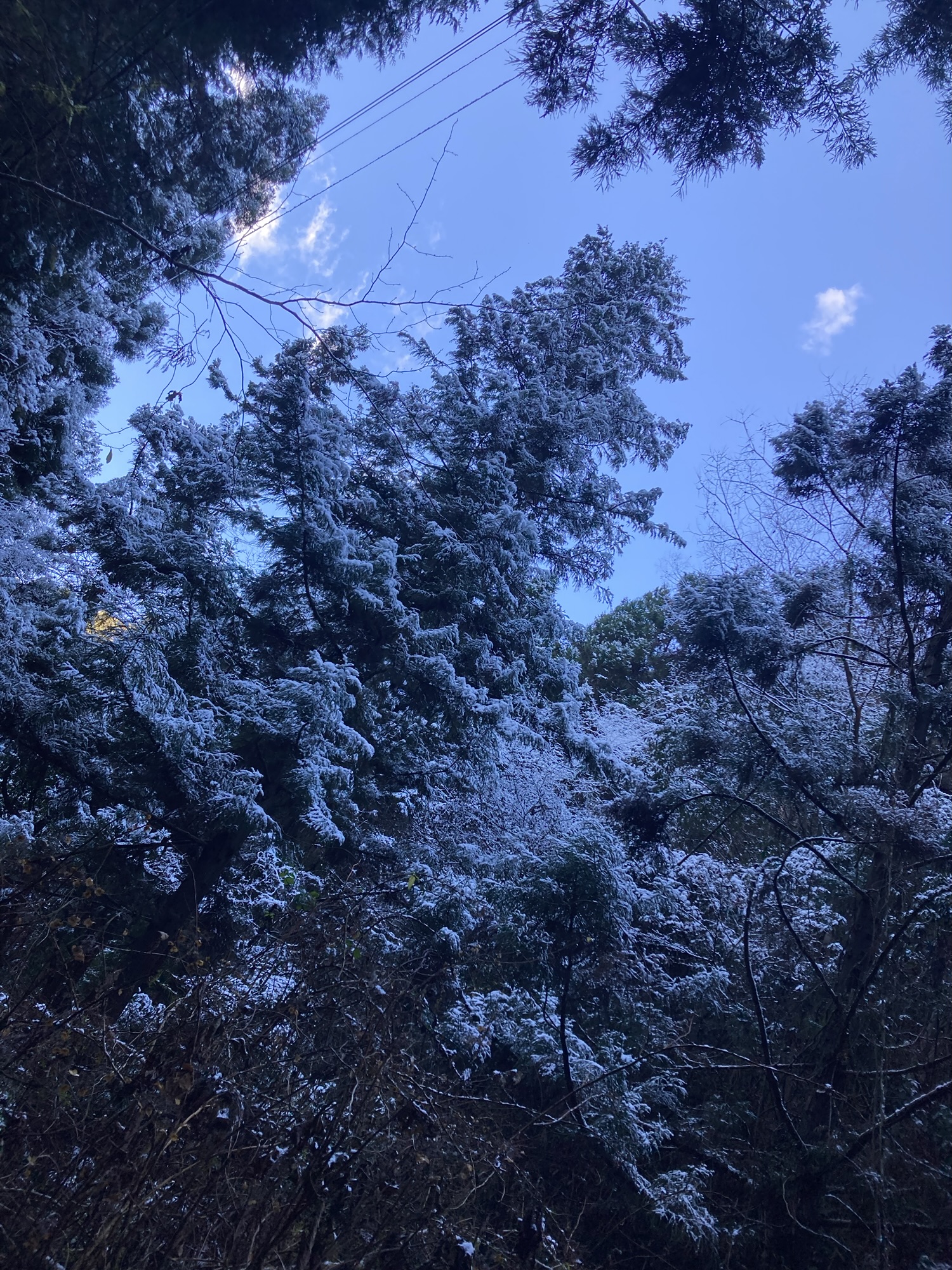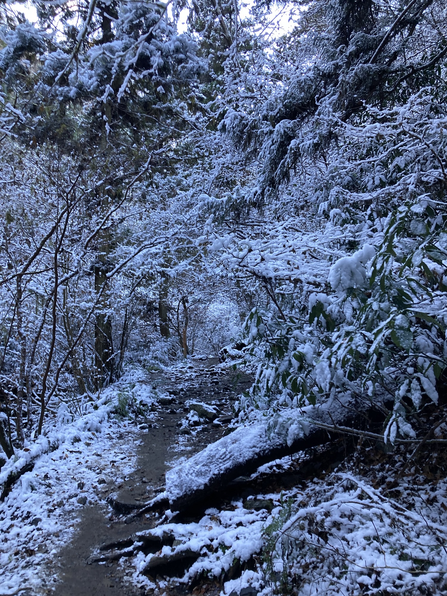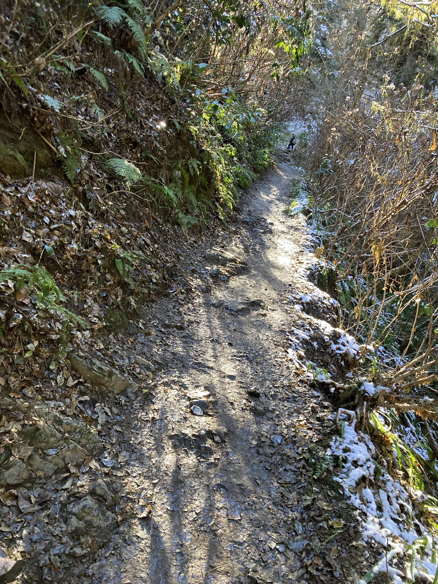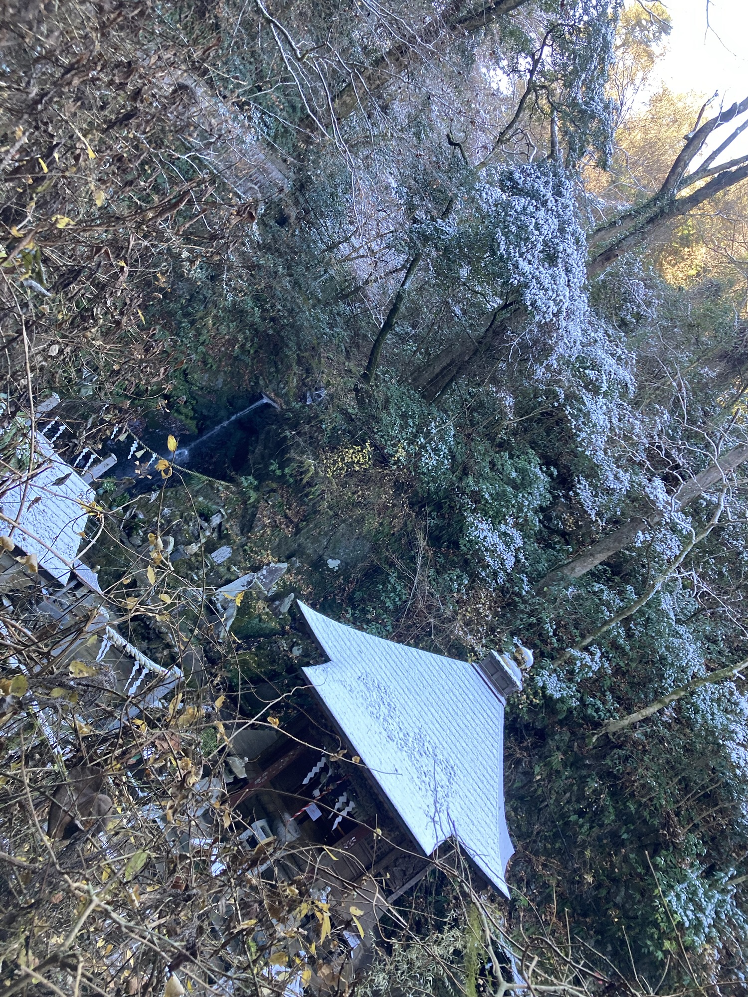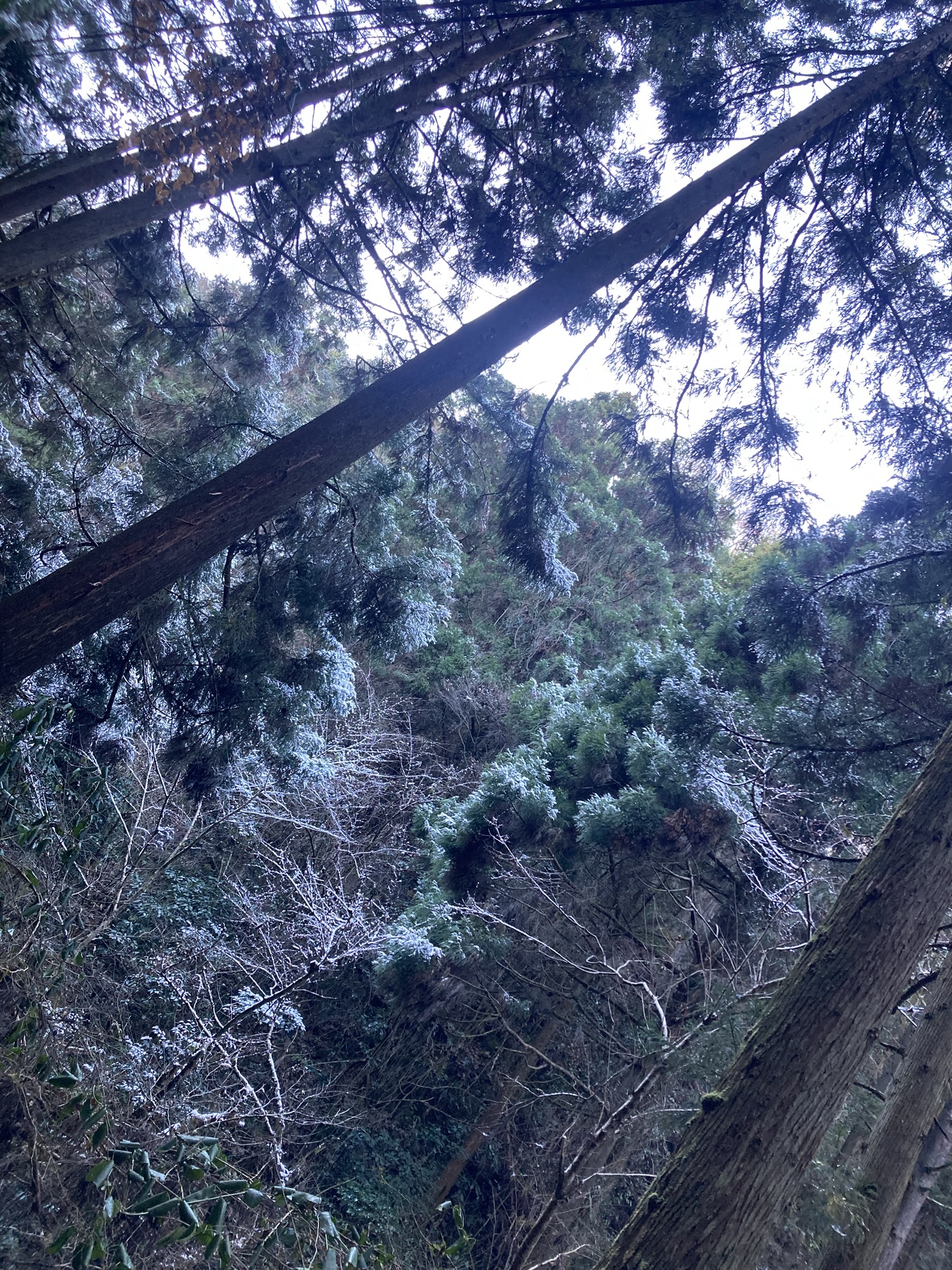 雪化粧した高尾山6号路を登山する。